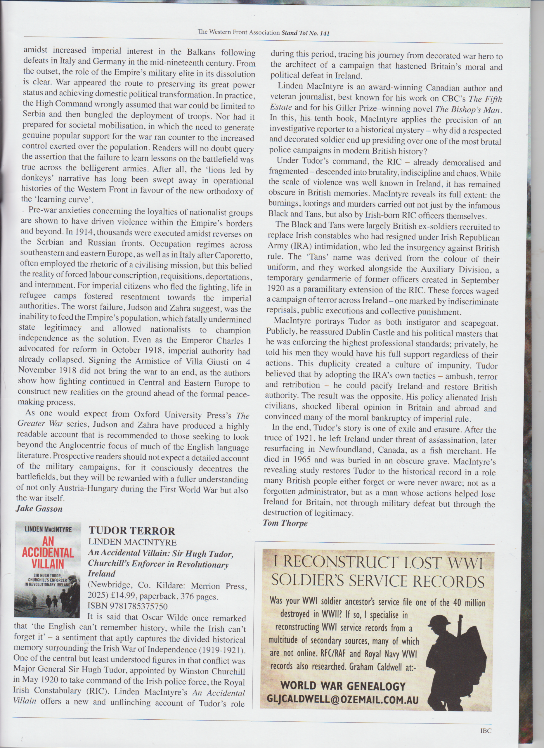 My review of Linden Macintyre’s excellent An Accidental Villain: Sir Hugh Tudor, Churchill’s Enforcer in Revolutionary Ireland (Newbridge, Co. Kildare: Merrion Press, 2025) in Stand To! 141 (March 2026).