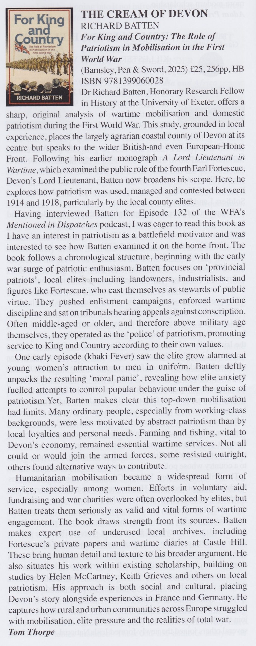 Book Review – Richard Batten, For King and Country: The Role of Patriotism in Mobilisation in the First World War (Pen & Sword, 2025) 2025-10-14 admin Uncategorized 0 My review of the above in Stand To! No.199 (September 2025